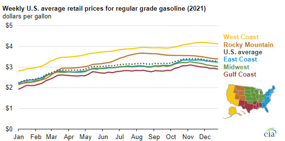 U.S. gasoline prices vary regionally, reflecting local supply and demand conditions and differences in state fuel specifications and taxes. The retail price for regular grade gasoline in 2021 averaged from a low of $2.67/gal on the Gulf Coast to a high of $3.70/gal on the West Coast. From January 4, 2021, to December 27, 2021, retail gasoline prices increased by $0.88/gal in the Midwest, $1.20/gal in the Rocky Mountains, and $1.32/gal on the West Coast.