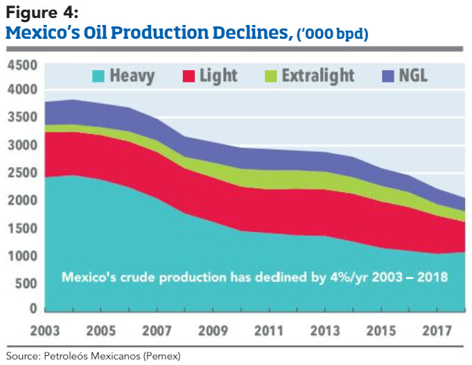 In 1998, Mexico exported 1.321 mmbpd of crude to the U.S. This fell to 0.665 mmbpd in 2018, a rate of decline averaging 3.4% per year over the last twenty years.