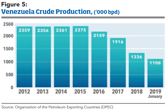 Venezuelan production also has been falling. Figure 5 illustrates the steep drop in output, which fell from 2375 kbpd in 2015 to 1336 kbpd in 2018, and to 1106 kbpd in January 2019. Between 2012 and January 2019, output has declined at a rate averaging 10.3% per year. Production is expected to fall even further in coming months, caused by the current social unrest and sanctions imposed by the U.S. Some estimates place Venezuelan production below 900 kbpd this year. The U.S. State Department expects it to fall as low as 500 kbpd by the end of the year under the weight of U.S. sanctions. President Nicolas Maduro defiantly claimed that he would “call upon investors from Arabic and Islamic countries to invest their money into developing the oil and gas industry,” and that he would increase crude production by 1 million bpd. Venezuela’s situation is at a critical juncture, discussed in more detail in the section following.