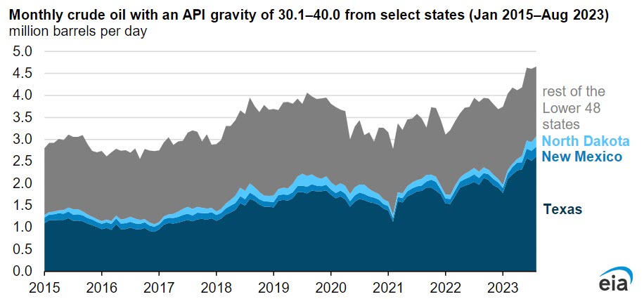 Overall in the Lower 48 states, 19% more crude oil with an API gravity between 30.1 and 40.0 degrees was produced in the first 10 months of 2023 than during the same period in 2022. In September 2023, Lower 48 crude oil production in this API gravity range established a new record of 4.75 million b/d.