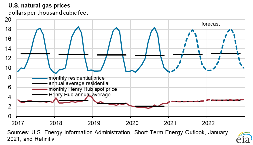 - Henry Hub natural gas spot prices averaged $2.03 per million British thermal units (MMBtu) in 2020. EIA expects Henry Hub prices will rise to an annual average of $3.01/MMBtu in 2021, limiting natural gas use for power generation amid reduced natural gas production. EIA forecasts Henry Hub prices will rise to an average of $3.27/MMBtu in 2022.