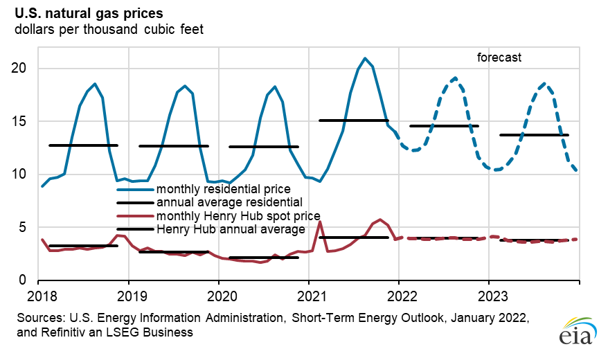 The natural gas spot price at Henry Hub averaged $3.91 per million British thermal units (MMBtu) in 2021. Monthly average prices reached $5.51/MMBtu in October, but they declined in November and December as mild weather prevailed across much of the country, resulting in less natural gas used for space heating. We expect Henry Hub spot prices will average $3.82/MMBtu in the first quarter of 2022 and average $3.79/MMBtu for all of 2022 and $3.63/MMBtu in 2023.