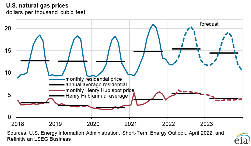 - We expect that U.S. consumption of natural gas will average 84.1 Bcf/d in 2022, up 1% from 2021. The increase in U.S. natural gas consumption is a result of colder forecast temperatures in 2022 compared with 2021, which results in more consumption in the residential and commercial sectors. In addition, we expect the industrial sector to consume more natural gas in 2022 in response to expanding economic activity. We expect U.S. natural gas consumption will average 84.7 Bcf/d in 2023.