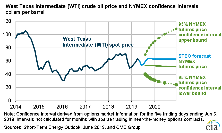 - Brent crude oil spot prices averaged $71 per barrel (b) in May, largely unchanged from April 2019 and almost $6/b lower than the price in May of last year. However, Brent prices fell sharply in recent weeks, reaching $62/b on June 5. EIA forecasts Brent spot prices will average $67/b in 2019, $3/b lower than the forecast in last month’s STEO, and remain at $67/b in 2020. EIA’s lower 2019 Brent price path reflects rising uncertainty about global oil demand growth.