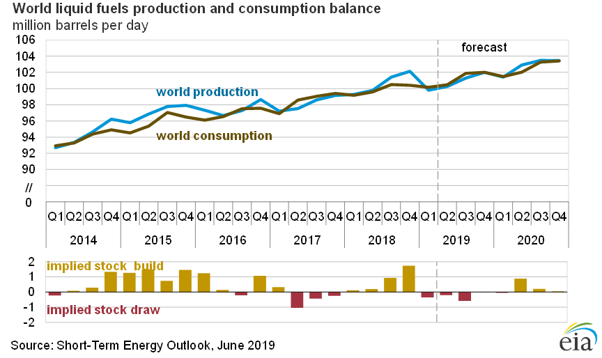 - EIA forecasts global oil inventories will decline by 0.3 million barrels per day (b/d) in 2019 and then increase by 0.3 million b/d in 2020. Although global liquid fuels demand outpaces supply in 2019 in EIA’s forecast, global liquid fuels supply is forecast to rise by 2.0 million b/d in 2020, with 1.4 million of that growth coming from the United States. Global oil demand rises by 1.4 million b/d in 2020 in the forecast, up from expected growth of 1.2 million b/d in 2019.