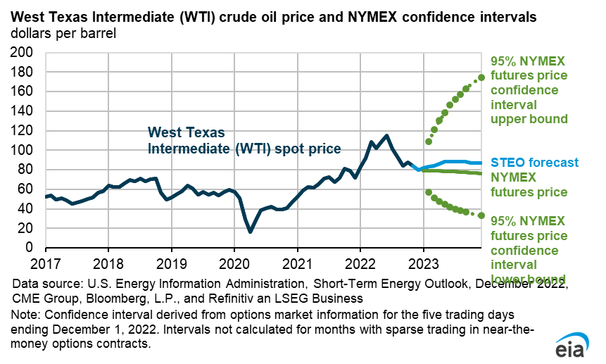 - Global oil inventories in our forecast fall by 0.2 million barrels per day (b/d) in the first half of 2023 (1H23) before rising by almost 0.7 million b/d in 2H23. This forecast leaves global oil inventories higher at the end of 2023 than we had forecast in the November STEO, which results in our Brent crude oil price forecast averaging $92 per barrel (b) in 2023, $3/b less than we had forecast last month.
