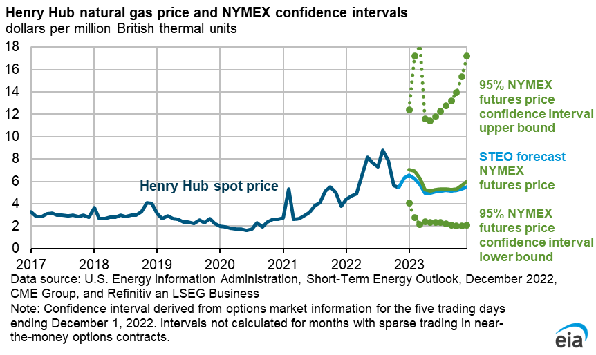 - We expect natural gas prices to increase from November levels as a result of both higher winter natural gas demand and rising LNG exports. Our forecast for the Henry Hub spot price averages more than $6.00 per million British thermal units (MMBtu) in 1Q23, up from November’s monthly average of about $5.50/MMBtu. We expect natural gas prices will begin declining after January as U.S. storage levels move closer to the previous five-year average, largely as a result of rising U.S. natural gas production. However, the possibility of price volatility remains high.
