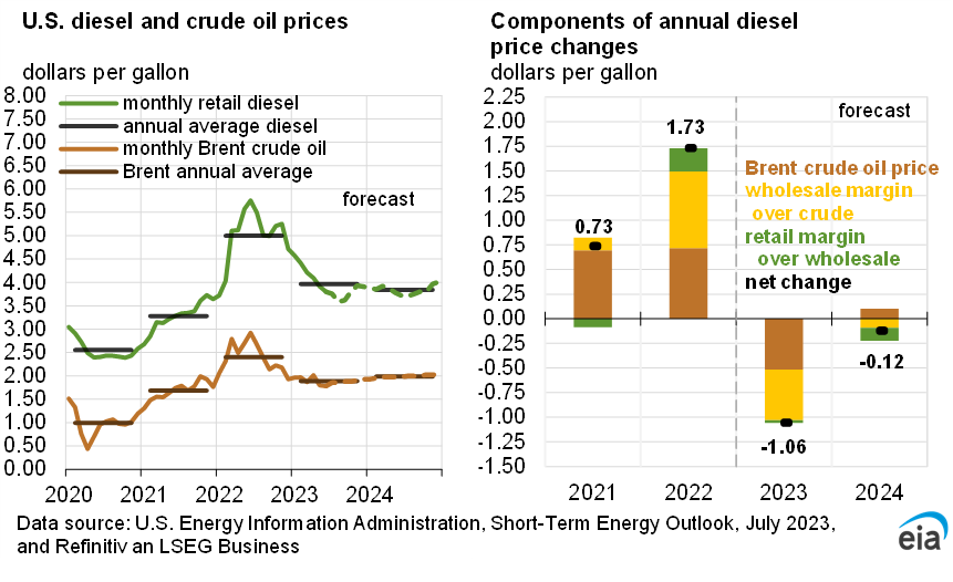 - Crude oil prices. We forecast that the Brent crude oil spot price will average $78 per barrel (b) in July. Crude oil prices gradually increase throughout our forecast, reaching about $80/b in 4Q23 and averaging about $84/b in 2024 because we expect that global oil inventories will decline over the next five quarters.