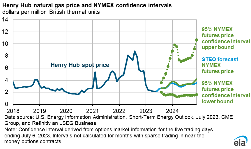 - Natural gas prices. We expect the Henry Hub spot price will rise in the coming months as declining natural gas production narrows the existing surplus of natural gas inventories compared with the five-year average. Henry Hub prices in our forecast average more than $2.80 per million British thermal units (MMBtu) in the second half of 2023 (2H23), up from about $2.40/MMBtu in the first half of the year.