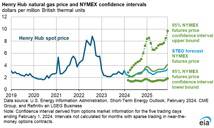 - Natural gas production. Because of disruptions in mid-January related to cold weather across the central United States, we estimate that U.S. dry natural gas production fell from a monthly record of 106 billion cubic feet per day (Bcf/d) in December to 102 Bcf/d in January. The January average was 3 Bcf/d lower than we had forecast in last month’s STEO. We forecast that U.S. natural gas production will increase in February and reach 105 Bcf/d by March as the weather-related disruptions subside and will stay close to that level for the rest of the year. Dry natural gas production averages 104 Bcf/d for all of 2024 in our forecast, almost 1 Bcf/d less than we forecast in last month’s STEO. We expect production will increase in 2025 to average more than 106 Bcf/d.