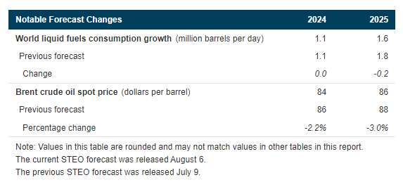 - Crude oil prices. Although crude oil prices have fallen recently, we continue to expect crude oil prices will rise in the second half of 2024 (2H24). The Brent crude oil spot price ended July at $81 per barrel (b), compared with an average for the month of $85/b. We expect the Brent price will return to between $85/b and $90/b by the end of the year. Rising crude oil prices in our forecast are the result of falling global oil inventories. We estimate global oil inventories decreased by 0.4 million barrels per day (b/d) in 1H24 and will fall by 0.8 million b/d in 2H24. Inventory withdrawals stem in part from ongoing OPEC+ production cuts. Although we expect crude oil prices to rise in the coming months, our forecast for the annual average Brent crude oil price in 2025 is down from a forecast of $88/b in our July STEO, owing mostly to reduced oil consumption.