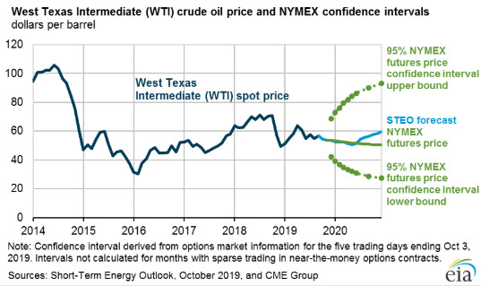 - EIA forecasts Brent spot prices will average $59/b in the fourth quarter of 2019 and then fall to $57/b by the second quarter of 2020, which is $5/b lower than forecast in the September STEO. Despite the recent increase in supply disruptions, EIA expects downward oil price pressure to emerge in the coming months as global oil inventories rise during the first half of 2020. EIA forecasts balances to tighten later in 2020 and expects Brent prices to rise to an average of $62/b in the second half of next year. The resulting forecast average price in 2020 is $60/b, $2/b lower than forecast in the September STEO. EIA’s October forecast recognizes a higher level of oil supply disruption risk than previously assumed, more-than-offset by increasing uncertainty about economic and oil demand growth in the coming quarters, resulting in a lowered oil price forecast.