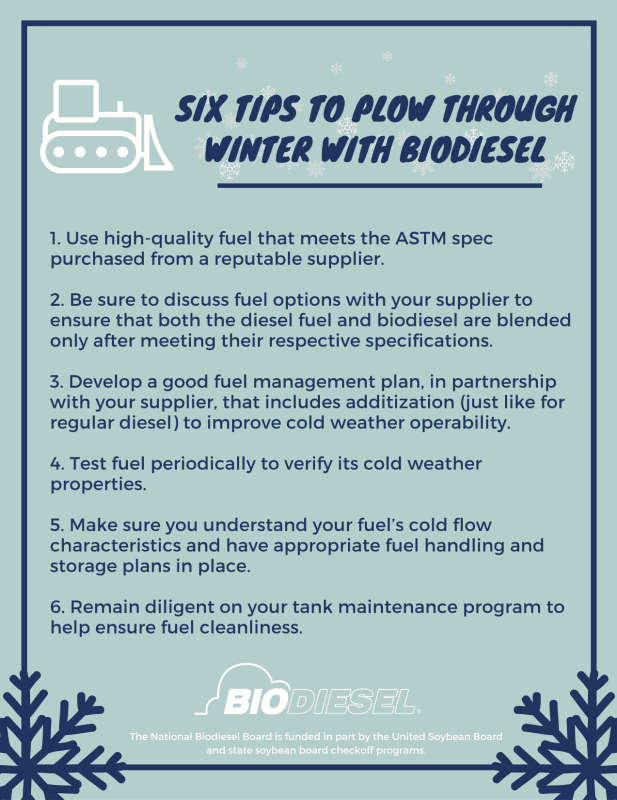 With just a little bit of care and upkeep that should be taken for all fuels, biodiesel can perform without the slightest issue during the upcoming cold months.