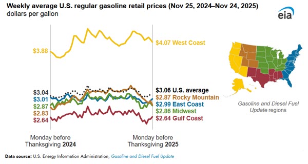 The Rocky Mountain region faces similar logistical constraints as the West Coast, although overall the region has both less supply and demand. Rocky Mountain retail gasoline prices averaged $2.87/gal on November 24, up 2% from 2024.