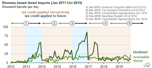 The U.S. government spending bill signed into law in late December 2019 included several provisions related to federal energy programs. Among these provisions was the reinstatement of a $1.00 per gallon biodiesel mixture credit, commonly referred to as the biodiesel tax credit (BTC). The BTC applies to both biodiesel and renewable diesel (referred to as biomass-based diesel) through 2022. The credit was also retroactively applied to 2018 and 2019.