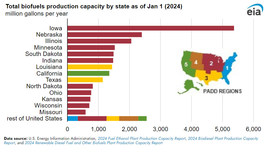 Most U.S. biofuels production capacity is located in Iowa, with more than 5.4 billion gal/y. Fourteen states located largely in the Midwest, the Gulf Coast, and the West Coast regions account for 90% of U.S. biofuels production capacity.