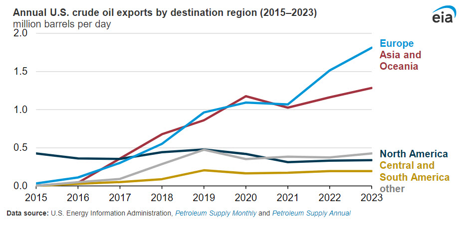 The top regional destinations for U.S. crude oil exports since 2018 have been Europe as well as Asia and Oceania. Europe became the top export destination in 2023 following the effects of Russia’s full-scale invasion of Ukraine and the inclusion of West Texas Intermediate (WTI) crude oil in Dated Brent. In 2022, U.S. crude oil exports to Europe increased significantly following Russia’s full-scale invasion of Ukraine and subsequent EU sanctions banning imports of seaborne crude oil from Russia (adopted June 3, effective December 5). These effects of the sanctions contributed to continued growth in U.S. exports to Europe in 2023. In 2023, U.S. crude oil exports to Europe averaged 1.8 million b/d, slightly more than U.S. exports to Asia and Oceania of 1.7 million b/d.