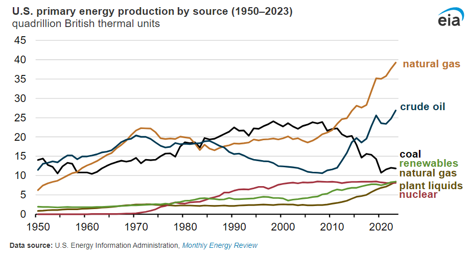 The increase in total U.S. energy production was driven largely by growth in the production of natural gas and crude oil in 2023. Dry natural gas production grew 4% to a record 39 quads in 2023, growing 58% since 2013. Crude oil production grew 9% from 2022 and reached a record of 27 quads in 2023, a 69% increase since 2013. Production of natural gas plant liquids, a byproduct of natural gas production, increased by 8% from 2022 to 8 quads in 2023. Natural gas plant liquids production has increased by 143% since 2013.
