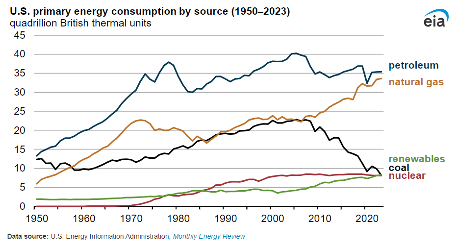 U.S. energy consumption declined slightly in 2023. Since reaching a record 99 quads in 2007, U.S. energy consumption has fluctuated between 89 quads and 97 quads per year. The combined consumption of petroleum and natural gas, the most-consumed energy sources in the United States in 2023, remained virtually unchanged from 2022 to 2023. Coal consumption fell 17% to 8 quads, the least since the 19th century, largely due to decreased use of coal for electricity generation.