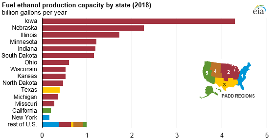 Most of the U.S. fuel ethanol production capacity is located in the Midwest region (as defined by Petroleum Administration for Defense District, or PADD, 2). Total nameplate capacity in the Midwest was 14.8 billion gallons per year at the beginning of 2018 (967,000 b/d), an increase of 5%—more than 650 million gallons per year—between January 2017 and January 2018. Of the top 13 fuel ethanol-producing states, 12 are located in the Midwest. The top three states—Iowa, Nebraska, and Illinois—contain more than half of the nation’s total ethanol production capacity.