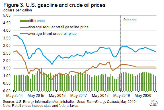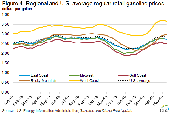 For all of 2019, EIA projects that U.S. regular gasoline prices will average $2.74/gal. The price of gasoline typically increases during the spring because of the switch from winter-grade gasoline to the more expensive summer-grade gasoline. This year, the average price for regular gasoline has increased by 16 cents/gal (6%) since the start of summer driving season in April.