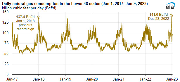 On December 23, 2022, natural gas consumption in the U.S. Lower 48 states reached a daily record high of 141.0 billion cubic feet (Bcf), according to estimates from S&P Global Commodity Insights. The previous record was 137.4 Bcf, set on January 1, 2018. Below-normal temperatures in mid- to late December increased demand for natural gas used for residential and commercial space heating and electric power generation. At the same time, natural gas production quickly fell because of mechanical issues caused by the cold temperatures.