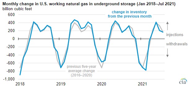 In our August 2021 Short-Term Energy Outlook (STEO), we forecast U.S. inventories of natural gas will reach 3,592 billion cubic feet (Bcf) by November 1, the beginning of the winter heating season. This amount is 159 Bcf below its previous five-year average (2016–2020). Above-average withdrawals of natural gas from storage in the 2020–2021 winter heating season and below-average injections into storage this summer contributed to our forecast of below-average inventories of natural gas, along with relatively flat dry natural gas production and high natural gas exports.