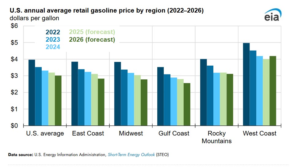 In our January Short-Term Energy Outlook, we now forecast U.S. retail gasoline prices through the end of 2026. We estimate U.S. average gasoline prices in 2025 will decrease by 11 cents per gallon (gal), or about 3%, compared with 2024. In 2026, we forecast a further decrease of about 18 cents/gal, or an additional 6%. The lower U.S. gasoline prices are primarily a result of lower crude oil prices, as well as decreasing gasoline consumption in 2026 because of increasing fleetwide fuel economy. Decreasing U.S. refinery capacity over the forecast period may offset some of the downward pressure of lower crude oil prices on gasoline prices.