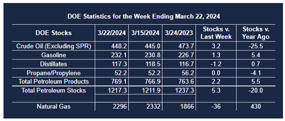 Supply/demand data in the United States for the week ended April 1, 2024, were released by the Energy Information Administration.