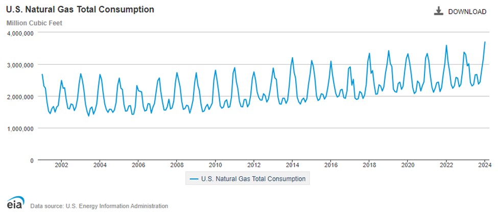 Demand for natural gas continues to make new highs. In January 2024 the United States consumed 3.696 Tcf of natural gas. The largest demand for natural gas came from the generation of electric power, 1.131 Tcf for the month. Nearly one Tcf (919 Bcf/month) was used by residential consumers, followed closely by industry, which took 802 Bcf for the month.