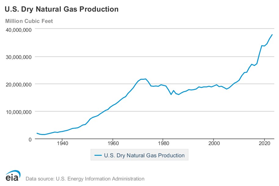The EIA has produced a chart of annual dry gas production since 1930. After a period of flat output between 1978 and 2005, production took off with the evolution of shale gas technology. In 2005, the United States produced 18.0 Tcf of dry gas. In 2023, the last year for which there is annual data, output more than doubled to 37.9 Tcf. Natural gas is now seen as the most environmentally friendly fossil fuel. Its desirability is not likely to diminish as other alternative fuels face their challenges.