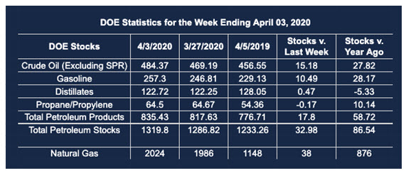 Supply/demand data in the United States for the week ending April 3, 2020, were released by the Energy Information Administration.