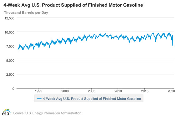 4-Week Avg Gasoline Supplied 1990 – 2020 source: US Dept. of Energy – EIA