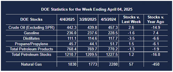 Supply/demand data in the United States for the week ended April 4, 2025, were released by the Energy Information Administration.