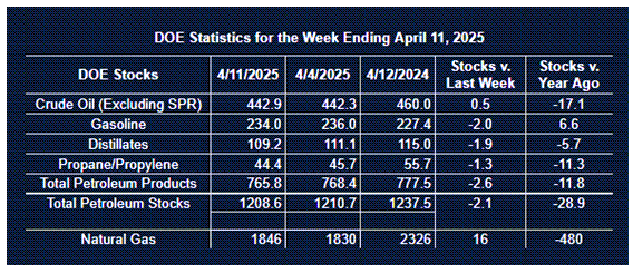 Supply/demand data in the United States for the week ended April 11, 2025, were released by the Energy Information Administration.