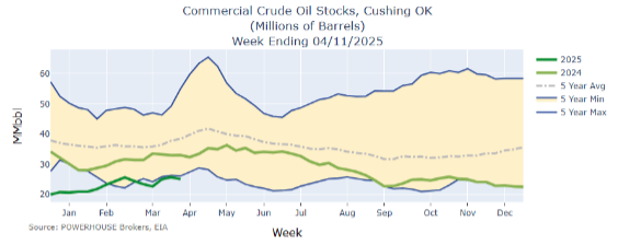 Cushing, Oklahoma, inventories were down (⬇) 0.7 million barrels to 25.1 million barrels.