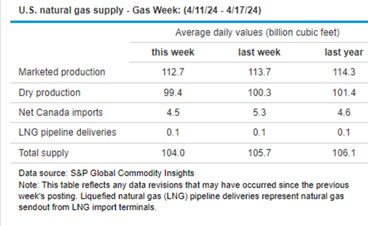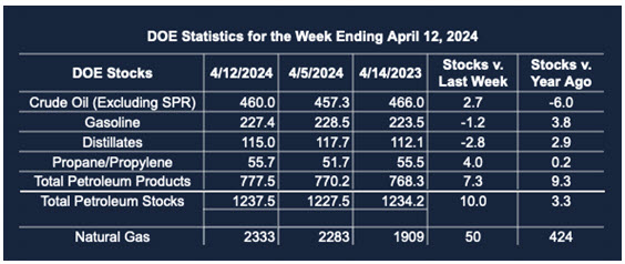 Supply/demand data in the United States for the week ended April 12, 2024, were released by the Energy Information Administration.