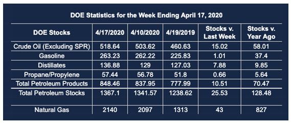 Supply/demand data in the United States for the week ending April 17, 2020, were released by the Energy Information Administration.