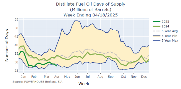 Supply/demand data in the United States for the week ended April 18, 2025, were released by the Energy Information Administration.