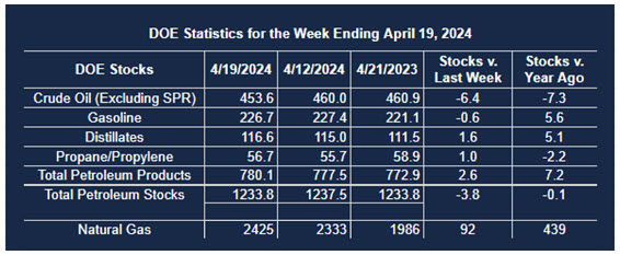 Supply/demand data in the United States for the week ended April 19, 2024, were released by the Energy Information Administration.