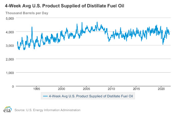 Demand for distillate fuels fell sharply in 2020 as the economy went into lockdown. Consumption fell to 3 million barrels daily in in the four-weeks ended May 1, 2020. This level had not been seen since the mid-1990s. As the economy reacted to an improving COVID-19 situation, demand reached 4.3 million barrels in February 2021, (assisted by winter heat requirements). Demand has since fallen back reaching 3.9 million daily barrels in the four weeks ended Aug. 6, 2021.