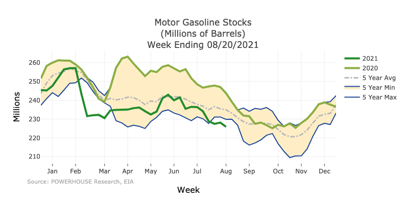 Supply/demand data in the United States for the week ended Aug. 20, 2021, were released by the Energy Information Administration.