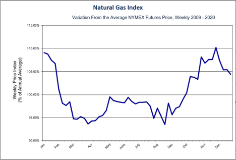 A natural gas price index shows the average annual natural gas price variation, based on data from 2009 through 2020. The pre-season price tends to start its winter climb in August, topping in November. The average increase over this period is around 17%, suggesting a possible winter objective of $4.68. An Elliott Wave count supports this view, with a completed third wave around that level.