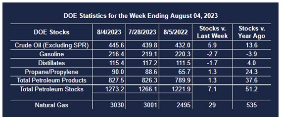 Supply/demand data in the United States for the week ended August 4, 2023, were released by the Energy Information Administration.