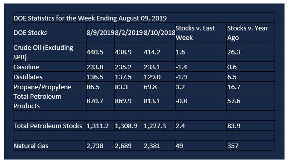 Supply/demand data in the United States for the week ending August 9, 2019, were released by the Energy Information Administration.