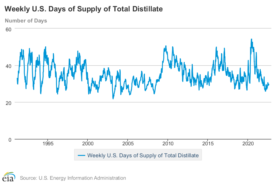 There are now 29.4 days of distillate supply in tank, slightly higher than at the end of the winter heating season. This is well below recent years. In June of 2020, the United States had more than 51 day’s supply, a record reaching back into the early 1990’s.