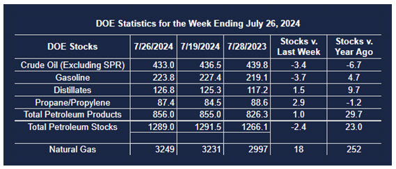 Supply/demand data in the United States for the week ending July 26, 2024, were released by the Energy Information Administration.