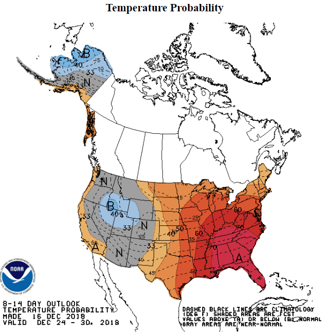 Natural gas prices fell sharply as the week of December 14th ended, notwithstanding storage falling below the five-year average. Daily futures prices fell nearly thirty cents and support at $3.91 was demolished. Unexpectedly high crude oil production is providing associated natural gas to the market, suppressing prices. NOAA 6- to 10- and 8- to 14-day weather maps anticipate warmer than normal temps. Next support is clustered around $3.24.