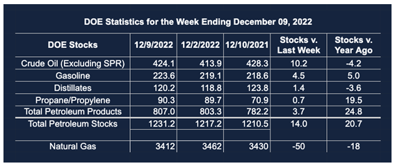 Supply/demand data in the United States for the week ended December 16, 2022, were released by the Energy Information Administration.