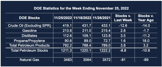 Supply/demand data in the United States for the week ended November 25, 2022, were released by the Energy Information Administration.